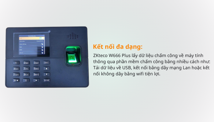 ZKteco W666 Plus có 3 cổng kết nối: USB, LAN và WIFI giúp bạn lấy dữ liệu từ xa bằng mạng Lan hoặc kết nối tải dữ liệu không dây qua Wifi, USB để chép dữ liệu khi vị trí đó không có mạng.