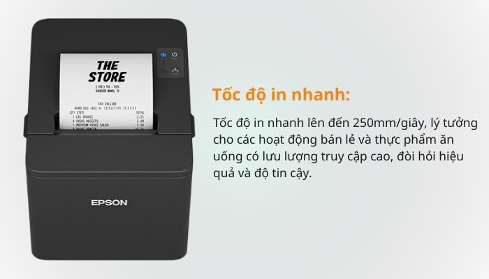 - Với tốc độ in tối đa 250 mm/giây, TM-T82IV giúp xử lý các giao dịch thanh toán một cách hiệu quả, giảm thời gian chờ đợi cho khách hàng. Ngoài ra, nắp giao diện bóng bẩy, trơn tru của máy được thiết kế để dễ dàng vệ sinh, giúp máy trở thành lựa chọn hoàn hảo cho các môi trường như nhà bếp và ki-ốt bán lẻ, nơi yêu cầu bảo trì nhanh chóng và độ bền cao.