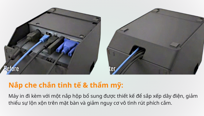 Máy in đi kèm với một nắp hộp bổ sung được thiết kế để sắp xếp dây điện, giảm thiểu sự lộn xộn trên mặt bàn và giảm nguy cơ vô tình rút phích cắm.