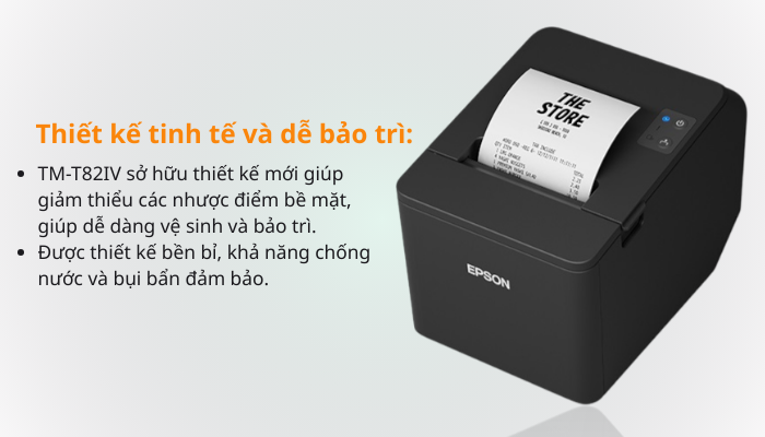 - Epson TM-T82IV với thiết kế theo kiểu "Nồi đồng cối đá" chịu va đập mạnh phù hợp với mô hình kinh doanh hoạt động công xuất cao, TM-T82IV được nhà sản xuất xây dựng lớp vỏ bằng chất liệu nhựa có độ cứng cáp cho độ bền cao, ngõ ra của bản in bill hướng lên để nhân viên thu ngân tiện tay khi lấy bill đưa đến khách hàng.