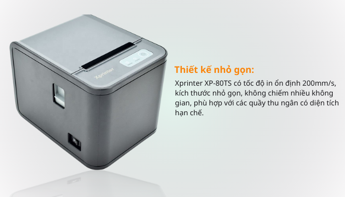 Máy in hóa đơn Xprinter XP-80TS là mẫu máy in nhiệt khổ 80mm nổi bật với tốc độ in nhanh 200mm/s, hỗ trợ tính năng tự động cắt giấy và thiết kế cho phép treo tường để tối ưu không gian.