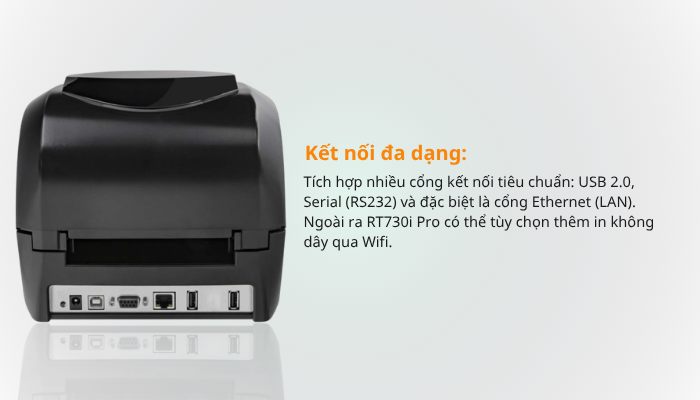 Godex RT730i Pro hỗ trợ cổng kết nối tiêu chuẩn USB và cổng USB Host giúp bạn in trực tiếp từ file chứa trong USB mà không cần máy tính, RS232, đặc biệt là cổng Ethernet nên dễ dàng kết nối với các thiết bị như máy tính để bàn, laptop hay máy bán hàng cảm ứng POS.
