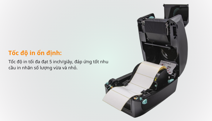 Tốc độ in tối đa đạt 5 inch/giây, đáp ứng tốt nhu cầu in nhãn số lượng vừa và nhỏ.