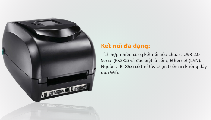 Godex RT863i Pro hỗ trợ cổng kết nối tiêu chuẩn USB, RS232, đặc biệt là cổng Ethernet nên dễ dàng kết nối với các thiết bị như máy tính để bàn, laptop hay máy bán hàng cảm ứng POS.