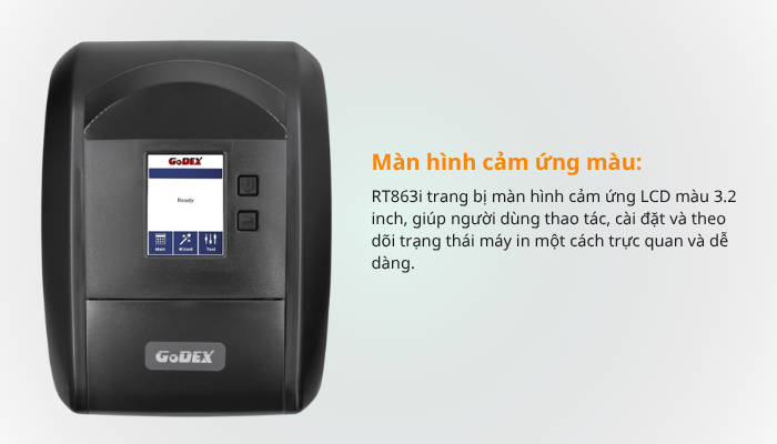 Trang bị màn hình cảm ứng LCD màu 3.2 inch, giúp người dùng thao tác, cài đặt và theo dõi trạng thái máy in một cách trực quan và dễ dàng.