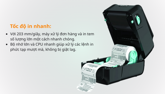 Tốc độ in 8 inch/giây giúp xử lý lượng lớn tem nhãn một cách nhanh chóng, giảm thời gian chờ đợi trong các quy trình sản xuất hoặc kho bãi.