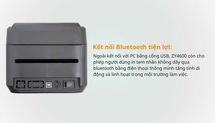 Zywell ZY4600 tích hợp cả cổng USB và BLUETOOTH, cho phép kết nối trực tiếp với máy tính hoặc in không dây từ điện thoại, máy tính bảng thông qua Bluetooth.